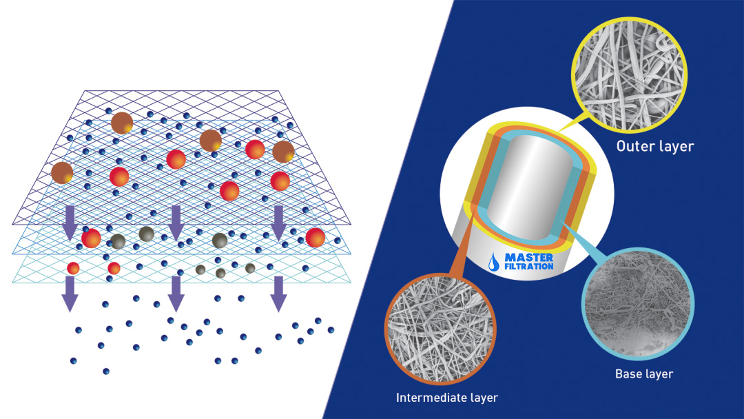 2. Gredient density structure to form deep filtration, making filter cartridge larger dirty capacity.